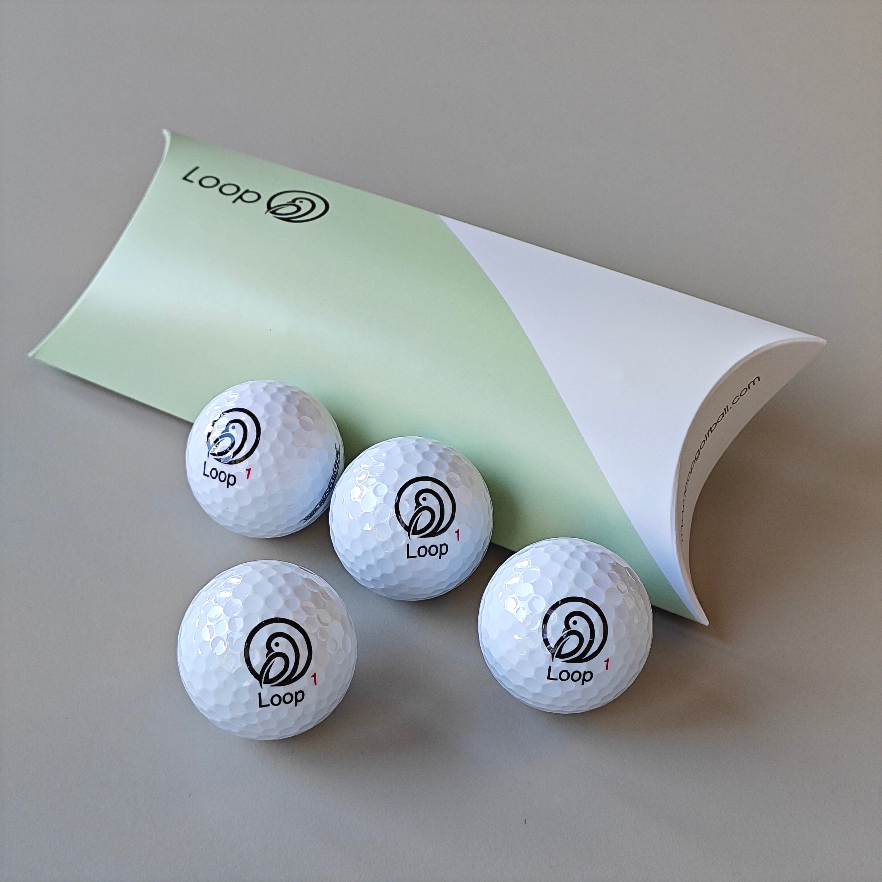 Kissenschachtel mit 4 Golfbällen, ideal zum ausprobieren und verschenken.